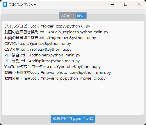 本ブログで紹介した自作ツールは、launcher フォルダ と同じ階層に全て置いてください。そして、設定画面に下記の内容を貼り付け、「編集内容を画面に反映」ボタンをクリックします。