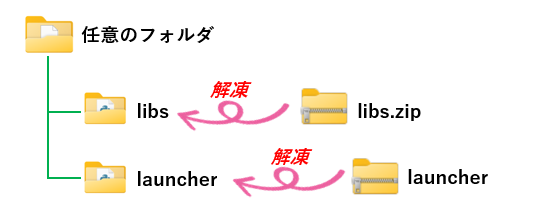 プログラム・ランチャーと共通パッケージの2つをダウンロードし、2つのフォルダが同一階層になるように解凍してください。