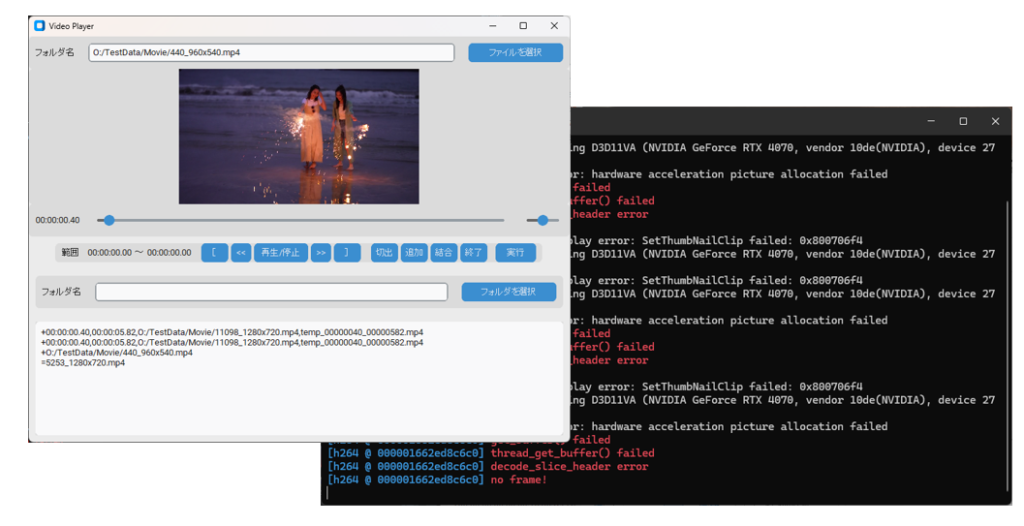 動画の再生中は vlc の処理状況が、分割・結合処理中は ffmpeg の処理状況がコンソール画面に出力されます。